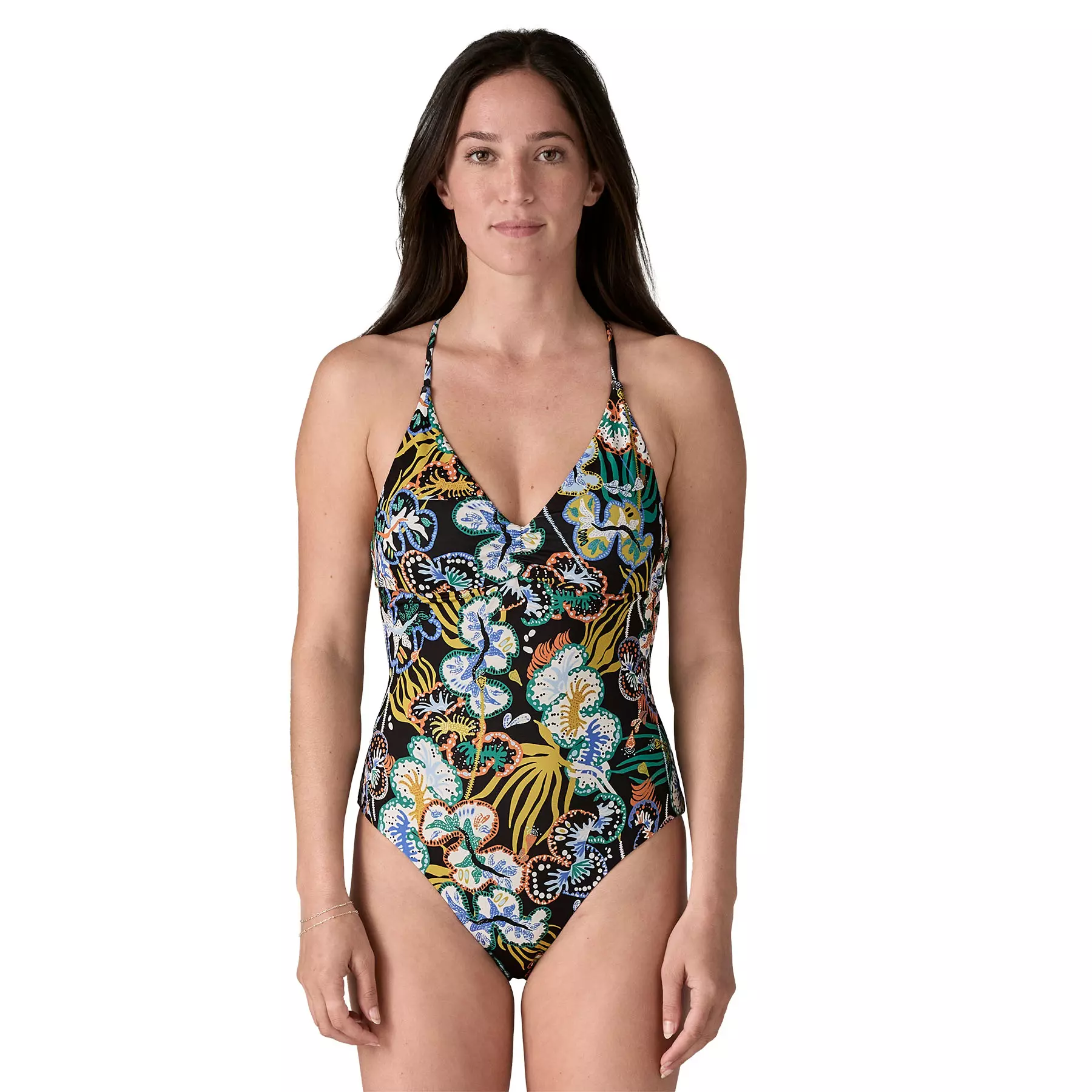Еднокомпонентен бански костюм с регулируеми презрамки и V-образно деколте, създаден за комфорт и свобода на движение при сърф и плуване.
