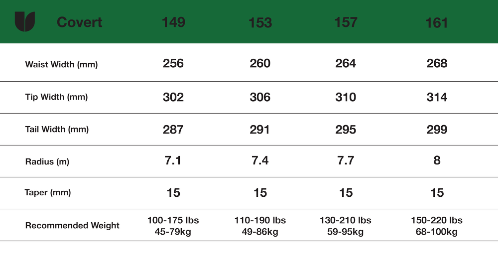 От отдалечени върхове до местни дървета, сплитбордът Covert е проектиран за максимална гъвкавост и производителност. Този круизър за всички планини и всякакви условия разполага със заострена, насочена форма с наклон за повишена стабилност при турне и ранно издигане в носа, за да ви държи на плаване през пресен сняг. Класическата, свободна опашка позволява фалшиво каране и повишава маневреността в труден терен. В един момент Covert е инструмент, който ви отвежда далеч от утъпканите пътеки, а в следващия е играчка, позволяваща свобода на изразяване и ангажиране с дивата природа в стил, който е изцяло ваш.