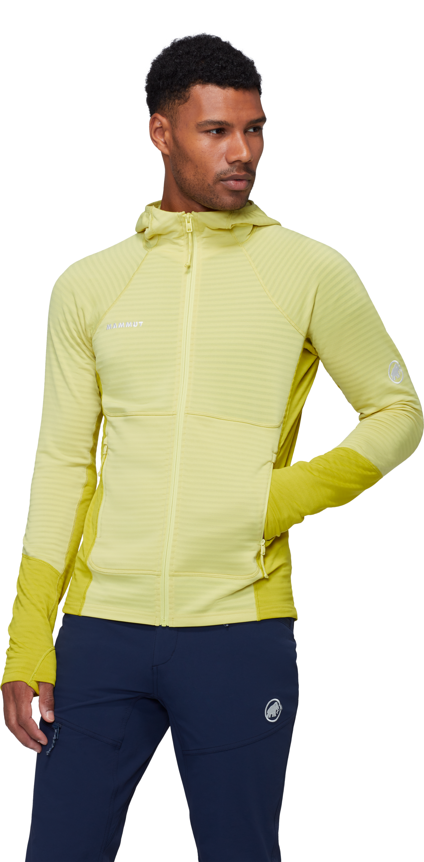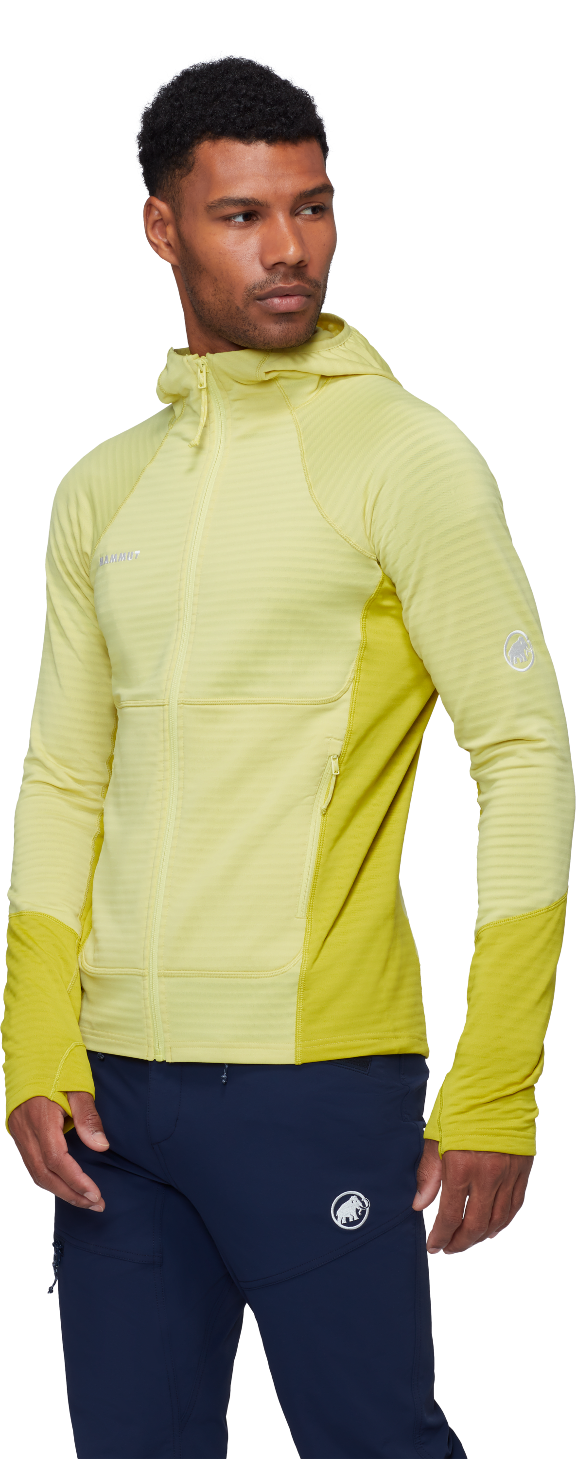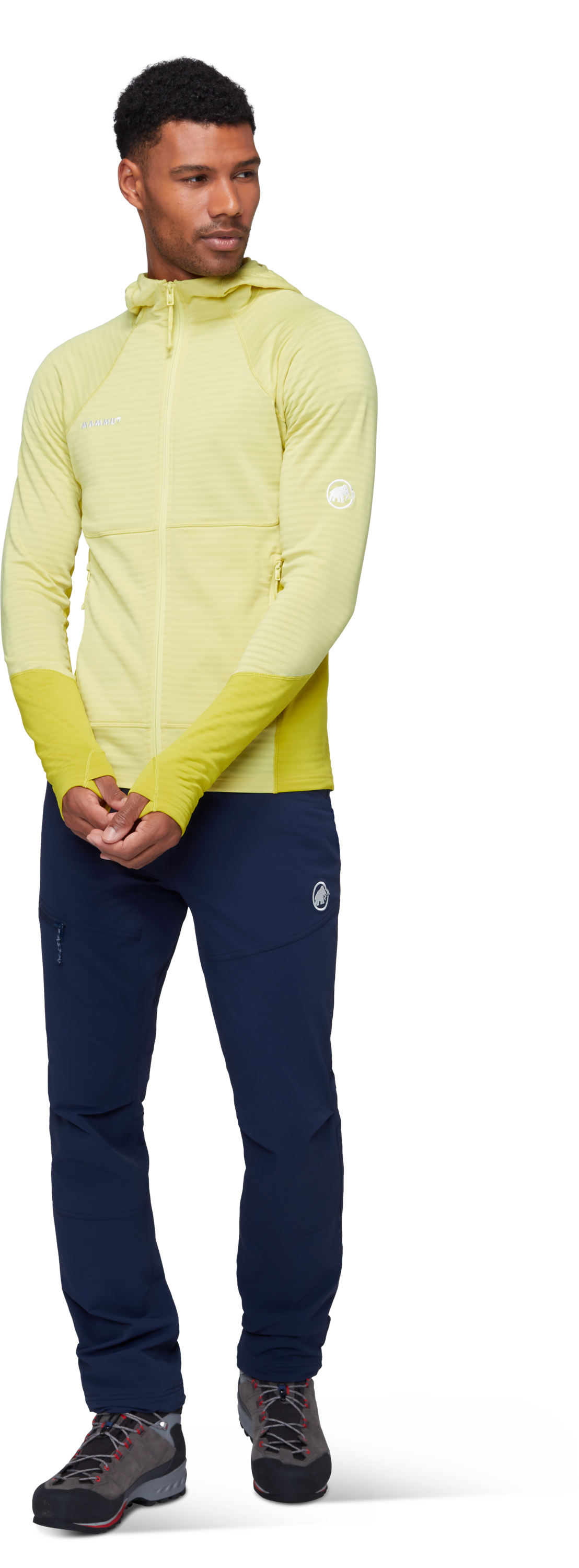 Кройката е Athletic Fit, което позволява по-прецизно прилягане към тялото, без да ограничава движението. За по-голяма функционалност моделът разполага с два джоба с цип, съвместими с раница и катерачна седалка, както и с функционален underarm gusset, който подпомага оптималната свобода на движение. Допълнителен комфорт осигуряват удобните отвори за палците и плоските шевове, които намаляват риска от протриване под презрамките на раница. Бродираното лого Mammut завършва чистия технически дизайн на модела.